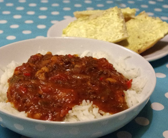 I love it with basmati rice and a fresh baguette and Vitalite (sunflower spread). Dan eats it with tortilla wraps and all the trimmings (jalapenos, vegan mayo, lettuce, salsa etc.).